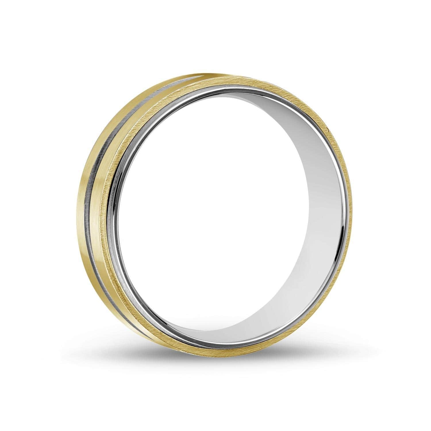 Sleek and stylish gold stainless steel wedding band for the modern man. This 7mm-wide comfort-fit band features a double row satin finish flat profile, bordered by polished step down edges. Ask us about engraving options!