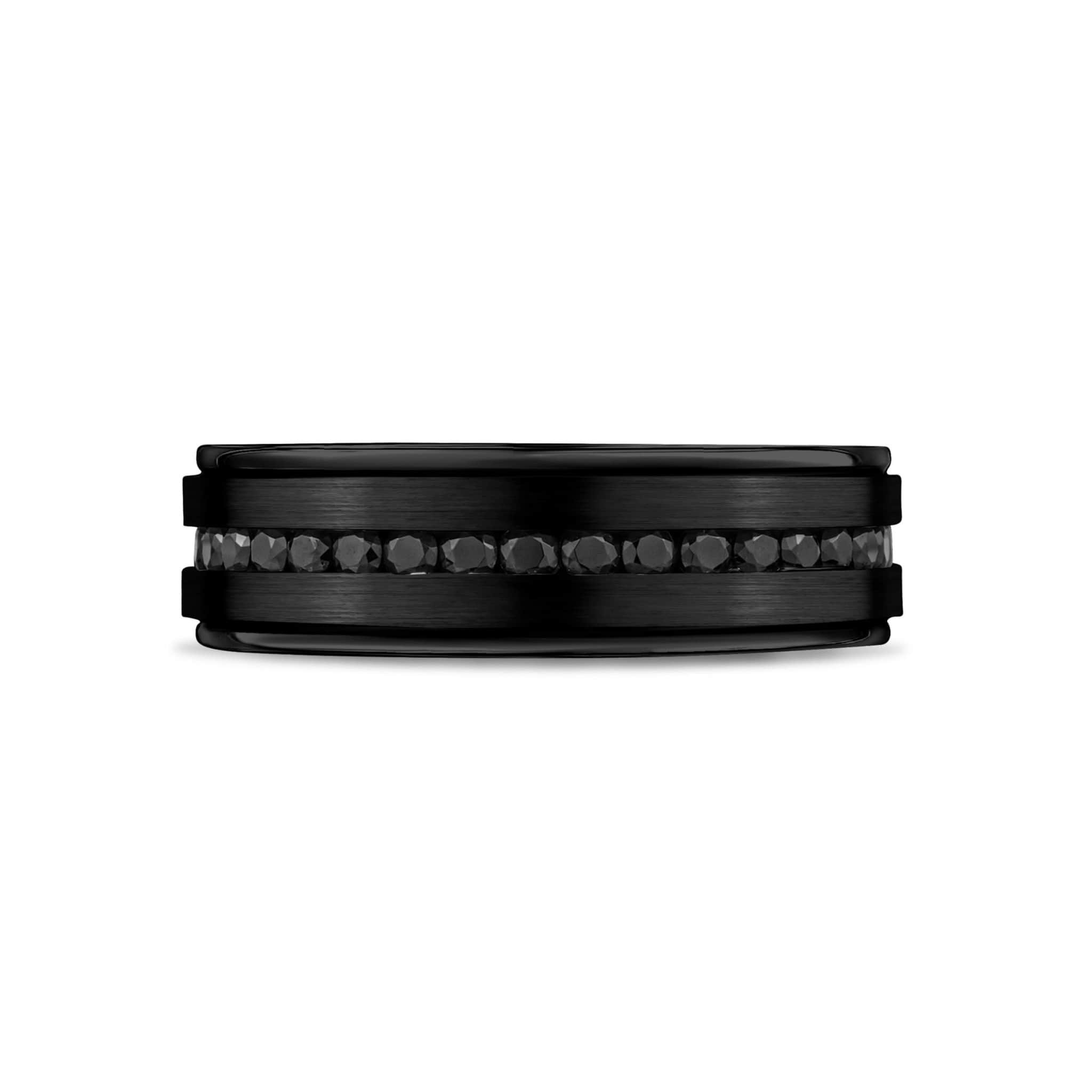Clean and refined stainless steel wedding band for the modern man. This stainless steel ring features a row of black cubic zirconia as well as a matte finish.