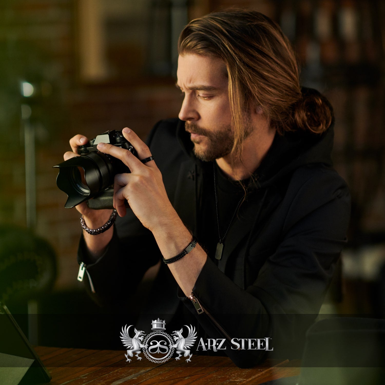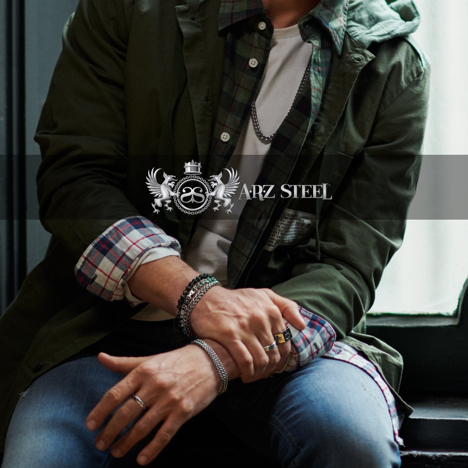 One of a kind type bracelet, this steel double Franco link bracelet is available in silver and black. The clasp features shiny cubic zirconia stones. Combine it with a watch or a cool leather bracelet for the perfect look!